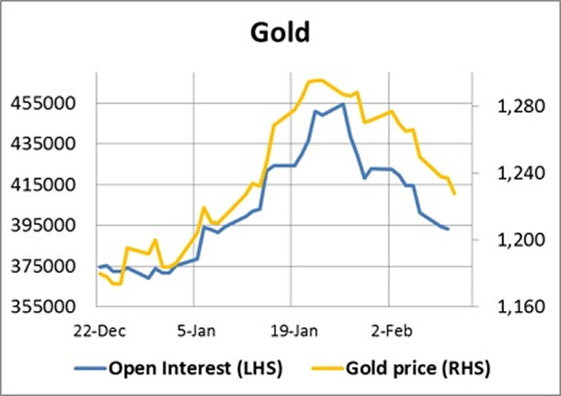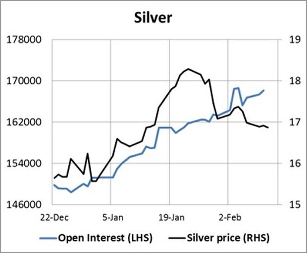The chart clearly shows the tight relationship between open interest and the gold price since late-December and suggests that on purely technical grounds there is still some limited scope for lower prices. Interestingly attempts to shake out bulls in silver have been less successful, as illustrated in the next chart.
