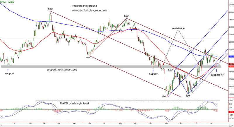 If we look at the daily chart of HUI below we see that, in the big picture, price has been making lower highs and lower lows - that's the definition of a downtrend. But focus now on the right side of the chart. Notice that since the low in November 2014 price has been making higher lows and higher highs - this meets our definition of an uptrend.