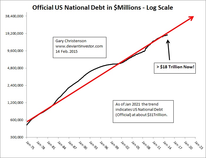The trend is clearly upward at slightly more than 9% per year. At that rate the official US national debt will exceed $30 Trillion before January 2021, unless our financial system crashes first.