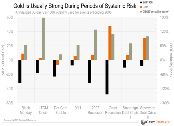 During these eight periods of high systemic risk, gold rose every time but one—and stock markets fell in all of them. This doesn’t mean the price couldn’t decline in the initial phases of a crisis, but it does show that gold is strong when fear is high.