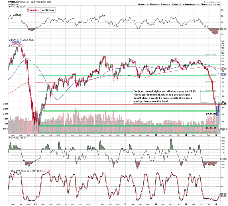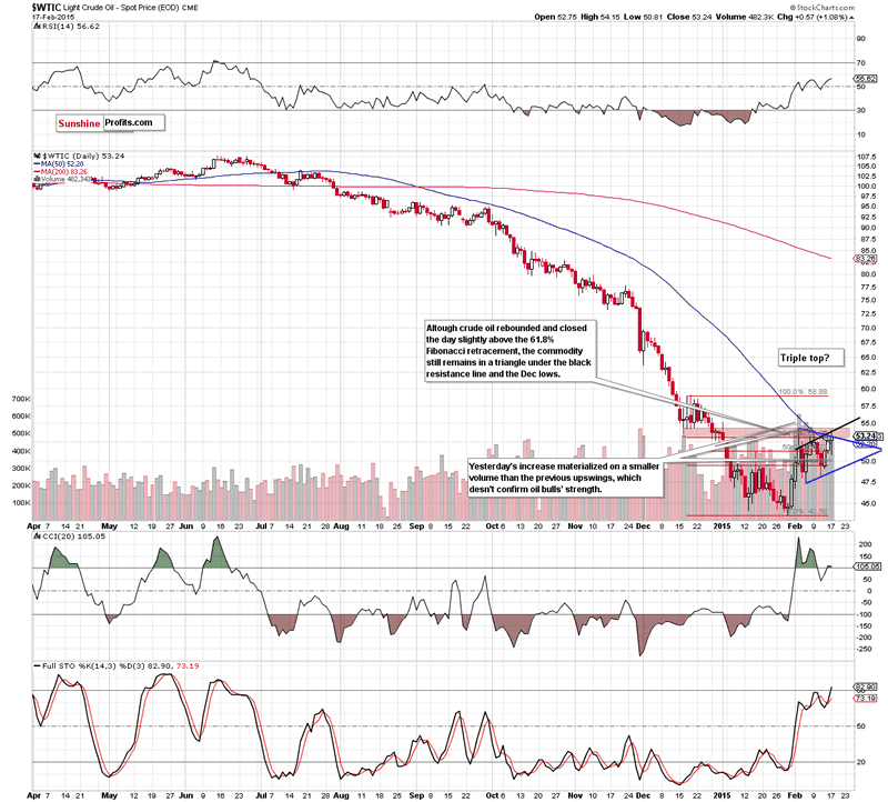 Yesterday, after the market's open, the price of crude oil moved sharply lower as growing concerns over the situation in Ukraine and Greece weighed on investrs' sentiment. As a reminder, pro-Russian rebels and government forces continue fight in east Ukraine, dampening hopes that a ceasefire will hold end the conflict. Additionally, talks between Greece and euro zone finance ministers broke down on Monday, which fueled worries about demand for oil in a unstable European economy. In response to these circumstances, the commodity dropped to an intraday low of $50.81. Despite this decline, light crude rebounded supported by a weaker greenback, which made the commodity cheaper for holders of other currencies. As result, light crude reversed and climbed above $54, but did this upswing change the very short-term picture? (charts courtesy of http://stockcharts.com).