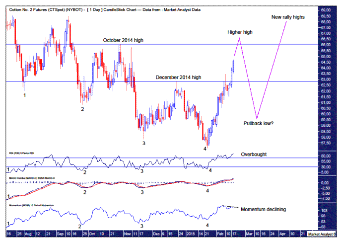 Price has already taken out the December 2014 high denoted by the lower horizontal line while I favour price taking out the October 2014 higher before any pullback commences. This is denoted by the higher horizontal line and stands at US$66.05.