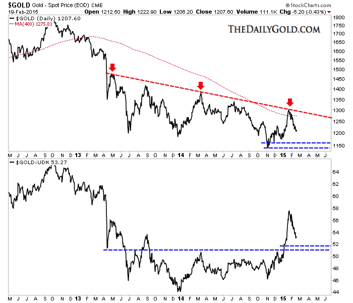 In the chart below we plot Gold and Gold priced in foreign currencies (Gold/FC) which is essentially the inverse of the US$ index. Gold put in a strong rebound, rallying over $150/oz from November through January. That was also its strongest rally in real terms in several years. As we can see, Gold/FC drove that rally as its driving the current decline (to some degree). Gold/FC has a bit more downside to go to reach support. The fact that Gold could not hold above $1240 tells us that Gold will need more time before it can retest trendline resistance. However, Gold’s strength against foreign currencies is a major character change that wasn’t in place during 2013-2014.