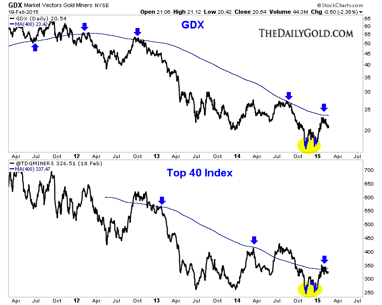 Next is a chart of GDX and our Top 40 Index. Both formed a strong double bottom at the end of 2014 and both will need to surpass their 400-day moving averages to be in a new bull market. The miners formed the recent low amid an extreme oversold condition. After a strong rebound, resistance has come into play. The range between strong support and strong resistance is getting smaller.