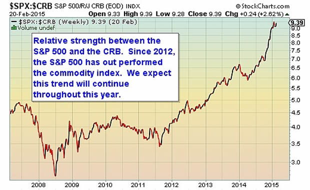 Investment approach: We suggest investors remain long in 2015 and weight portfolios toward non-commodity industry groups and indexes. The lower chart highlights our rationale. The S&P 500 has outperformed the Commodity Research Bureau Index since 2012.