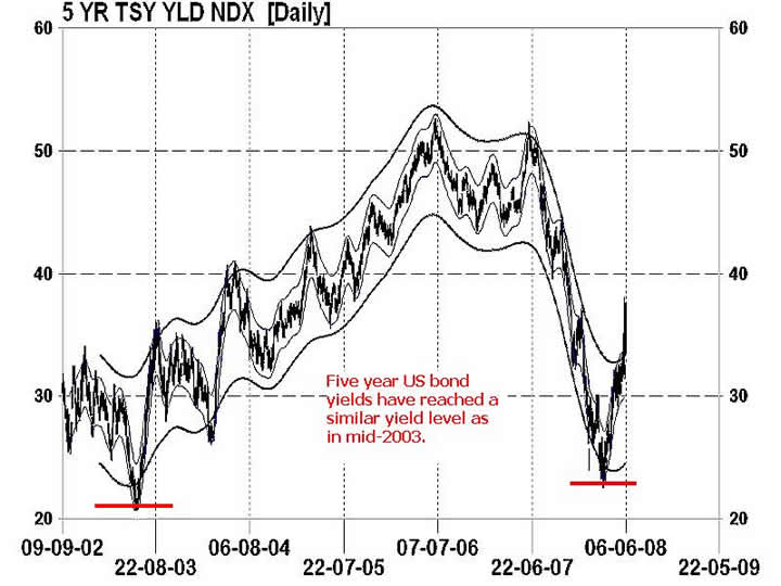 Five year U.S. Treasury bonds are one of the most sensitive durations to Fed interest rate changes. Chart 1 shows that yields have been falling since mid-2007 and had declined down to 2.18% in March, a yield level very similar to the Fed's last round of bear market rate easing in 2003. And like bond yields, after that rate reductions in 2003 where five year Treasury rates vaulted upward, yields are now moving up steadily as bond traders sensed the completion of rate reductions and began bidding up bonds by mid-April.
