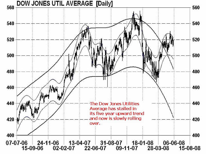 In Chart 2 of the Dow Jones Utilities Average, this highly interest rate sensitive equity group began displaying early signs of weakness by late April. After over five years of steady advancing, technical models are indicating a deterioration in price levels is expected in June and July. Utilities typically rise in an environment where interest rates are stable or declining. Conversely, share prices in utilities usually weaken on interest rate increases.