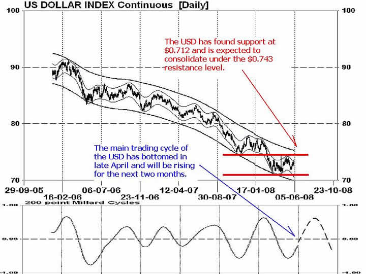 The U.S. dollar (Chart 3), has also displayed technical evidence of no additional rate reductions in late April. Interest rate cuts are normally negative for the greenback because they offer a lower return for the dollar verses other major currencies. With the prospect of U.S. dollar protection and renewed fears of inflation, this translates into a retention of the 2% Fed rate and the very real potentially to rate increases later in 2008. In response, currency traders began supporting the dollar at $0.712 and held it up against further declines.