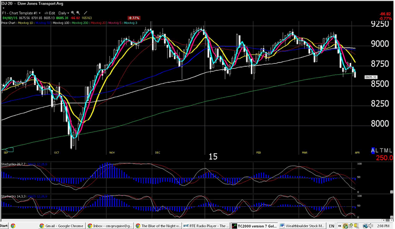 To help answer that question we need to look more closely at the Dow 20 Transport Index. The daily chart below indicates that the December 2014 low has been violated and that the 200 daily moving average has been broken. This is bearish. Thus on probability I see the Dow 30 being pulled down by the Dow 20.