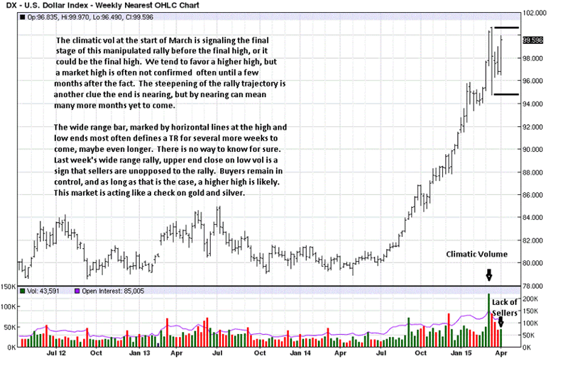 A look at the fiat faux “dollar” chart, the antithesis of gold, may offer the best clue as to why PMs remain mired in the trading range reaches within their protracted down trends.