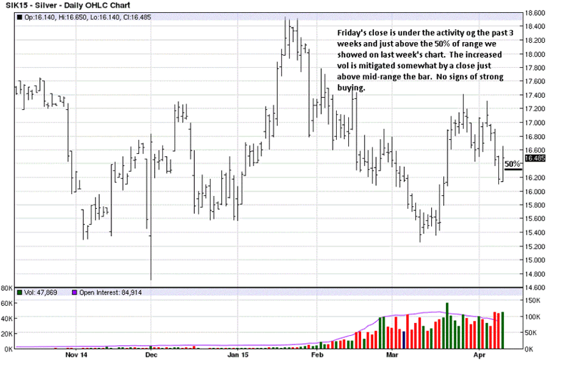 Daily silver is in the middle of a TR, and that is where the LOK is at its least. [Level Of Knowledge]. We choose not to push on a string in any market.