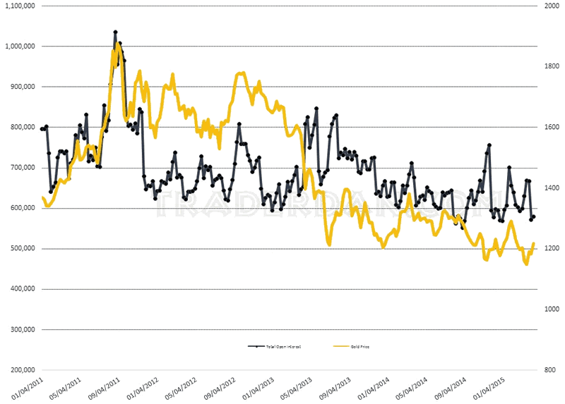 Notice how the gold price tends to rise and fall with each rise and fall in the total open interest line. This serves to illustrate my view that it is large speculative interests ("open interest") that drive our markets. Without that speculative interest in the market, there is no driver, no thrust to push prices significantly higher. Instead, what one gets is a grinding type of choppy, often random and meaningless, back and forth, up and down, sort of price action without any sort of clearly defined trend. In almost every case in which I see this pattern of lackluster speculative interest, the result is a gradual decline in price over time. We are currently seeing that exhibited in gold.