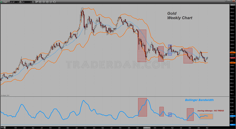 Taking a look at the same weekly chart but this time using the Bollinger Bands to get some insight into the price action one is struck by the relatively flatlining of the Bandwidth indicator for most of the year 2015 thus far. The bands are essentially moving parallel to each other which confirms the ADX reading. In other words, the market is going nowhere fast.
