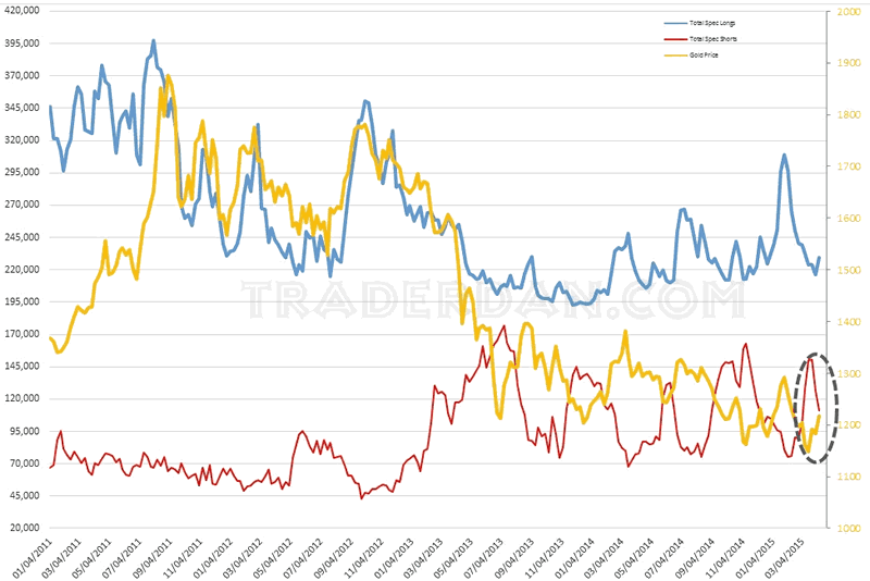 You can see this from this chart noting the total speculative long and short positions in gold (note - these are outright positions, not net positions). Look at the area within the ellipse on the chart and you can see the sharp drop in outright short positions among the speculators. Specs have covered a whopping 40K short positions over the last two reporting weeks with a corresponding $60 rise in the gold price. If you look at the number of speculative long positions higher up on the chart, you can see that it barely moved higher over that same time frame. Only 5000 new long positions have been added in the same speculative category!
