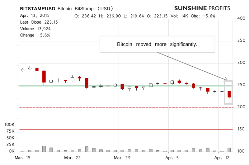 Bitcoin followed lower and today also looks like a continuation of the bearish trend. Bitcoin has depreciated slightly (this is written after 10:00 a.m. ET), almost hitting $215 at one point. The volume is shaping up to end close to what we saw yesterday (the day is not over yet, mind). The most pressing question you might consider based on the already profitable hypothetical short position is whether it's time for a pause or a short bounce to the upside. A move up is definitely possible since Bitcoin has been falling for some time now. On the other hand, we still are not in oversold territory, so there still might be room for declines before a counter-trend move up materializes. We opt to wait and see as in the past significant local tops have only been in after Bitcoin moved to positions more oversold than what we're seeing just now.