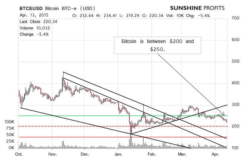 Bitcoin is below $250, there has been no rebound. Over the last week, the days with the highest volume levels were those when we saw more pronounced declines. Today, we haven't really seen much action (...) but all this fit pretty well with the bearish scenario. Bitcoin looks like it's stopped below the $250 level to consolidate or even more up slightly. A shallow correction to the upside could be seen at this time. On the other hand, the fact that the recent depreciation hasn't really been significant leaves room for even more declines and this is the outcome we would bet on. In other words, if the short-term outlook was bearish on Friday, it is even more so today. Actually, the outlook has been deteriorating for some time now, without a significant move to the downside. This makes the current situation a potential opportunity for a short trade. If Bitcoin continues falling, we might see the currency at $200 (dashed red line in the chart) or even lower.