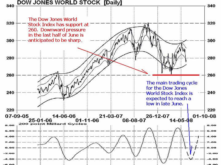 The Dow Jones World Stock Index is a composition of 3,000 companies from 120 countries. This index is an excellent gauge to measure global market movements. Since the forecast in April for the major late June low, world markets (Chart 1) have slowly advanced up to solid resistance levels by mid-May and then started a waterfall drop. Technical models are indicating that this anticipated late June trough will not go below the March lows of 260. In fact, support is likely to occur slightly higher. This expected action suggests a base is building for capital markets which should provide the foundation for a summer rally. Models also indicate that this expected rally in July and August is likely not a spring board to new highs but rather part of a broader consolidation under stiff upper resistance levels. Once this late June low has arrived, the next major trough is not expected until December or January.