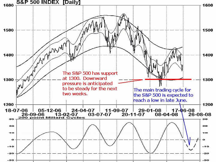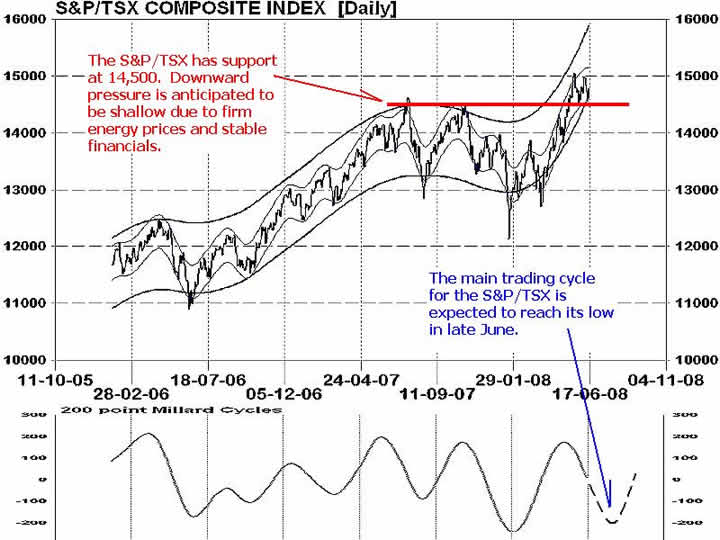 Though the global average in capital markets points to a low in June followed by a limited rally over the summer, not all stocks are created equal. There are four equity markets in the world that have climb to new highs and they are all commodity-based. Canada's S&P/TSX Composite Index is one of those world leaders in performance and it is mainly due to its ability to produce oil and gas. Chart 3 illustrates that, though a June low is still anticipated, support during the next two weeks should develop at 14,500. This high level of price support, compared to the S&P 500 and global markets in general, is generating from world demand for Canada's wealth of natural resources. The upside target for the TSX is 15,500. This number should be achieved cover the summer months. The S&P/TSX Composite, though expected to climb to news highs in 2008, should still move instep with other world stock markets and create another major low in December or January.