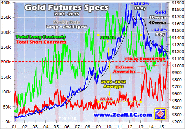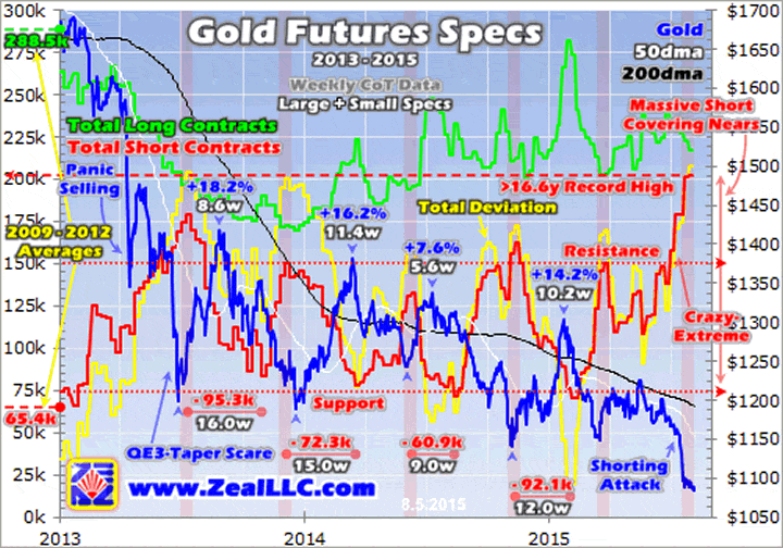 The bottom line is gold’s deep new secular lows are totally artificial. They weren’t driven by righteous fundamental gold selling, but by extreme record gold-futures short selling. Speculators seized a rare opportunity to foment a gold flash crash with a Machiavellian exquisitely-timed epic burst of shorting, and succeeded. This was falsely interpreted as legitimate selling, which greatly damaged psychology.