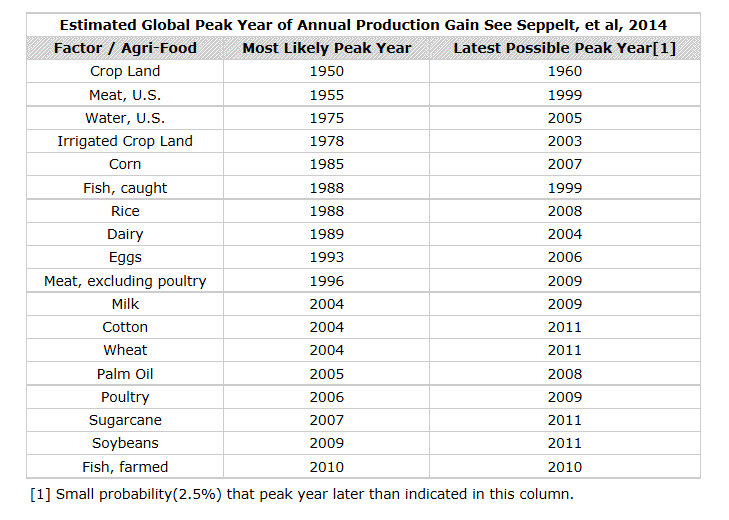 In their research Seppelt, et al studied the long-term production records of 27 renewable and non renewable resources. Our interest is primarily with the Agri-Foods they studied, which are classified as renewable resources. 17 Agri-Commodities were studied, from cotton to corn to rice and soybeans. Included were the bulk of the Agri-Commodities that feed the world.
