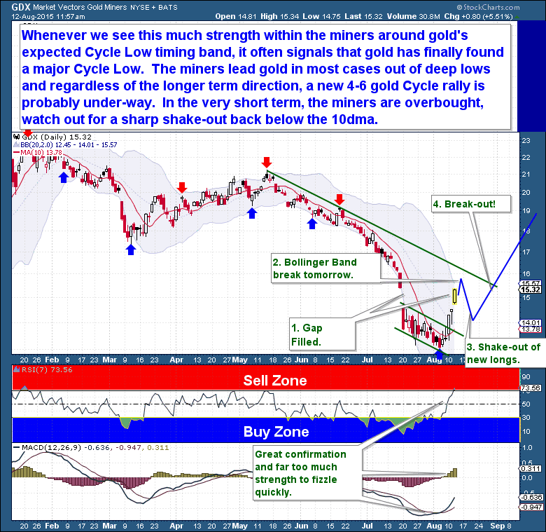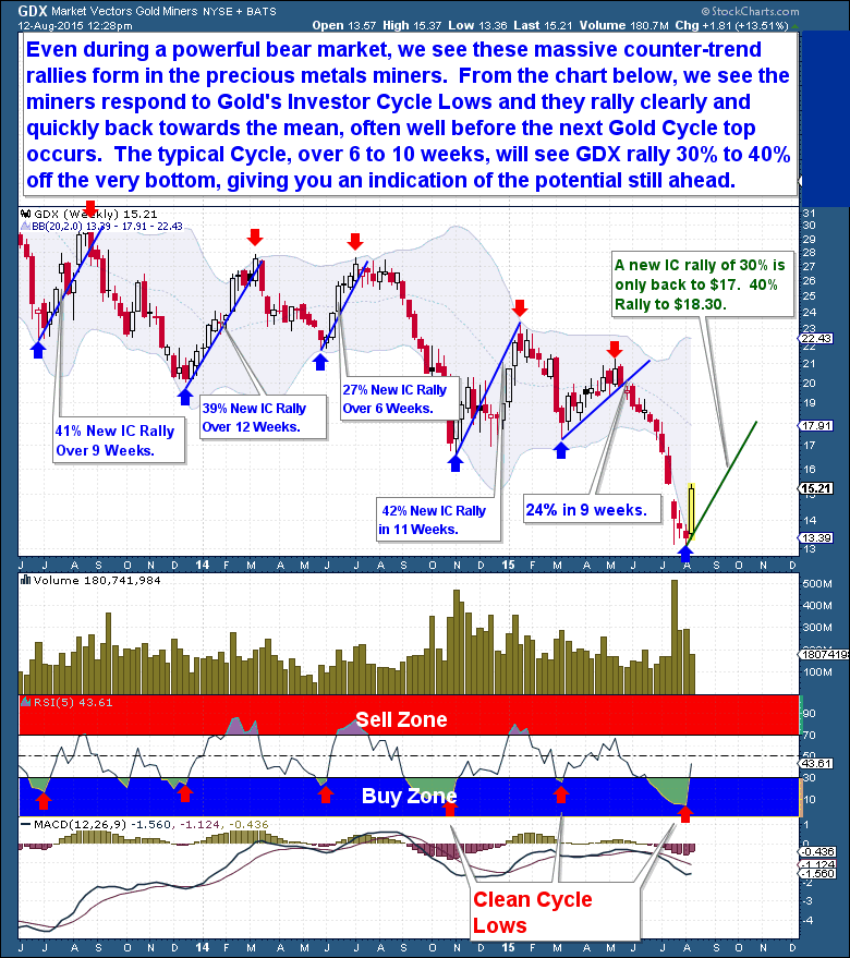 A word of caution though, the miners are short-term overbought. Anyone buying in here should be aware that a fast 1 to 2 day drop, back below the 10dma, is actually quite possible and within character. Looking longer term, throughout this powerful bear market, we see these massive counter-trend rallies form in the precious metals miners. From the chart below, we see the miners respond to Gold’s Investor Cycle Lows and they rally clearly and quickly back towards the mean, often well before the next Gold Cycle top occurs. The typical Cycle, over 4 to 8 weeks, will see GDX rally 30% to 40% off the very bottom, giving you an indication of the potential still ahead.