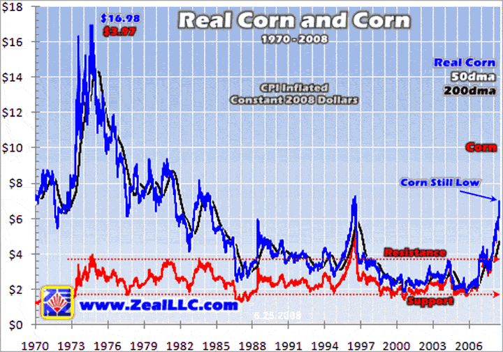 These weather problems mixed with a number of other factors are contributing to a corn price that is right now nearly going parabolic. So far in 2008 corn has risen by over 60% and it has already well-surpassed its all-time nominal highs.