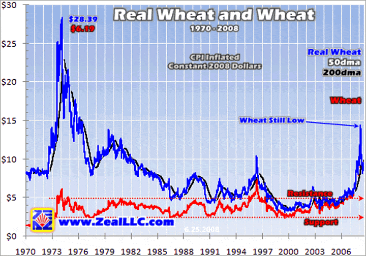 So far since its low of $2.60 in 2000, wheat has risen by over 400% . And while wheat has corrected since its February highs of around $14, it is still well above multi-decade resistance. But in adjusting the price of wheat for inflation, these nominal highs are nowhere near real highs. Using the CPI to inflate wheat's price over time, in constant 2008 dollars its real high from the early 1970s is over $28!