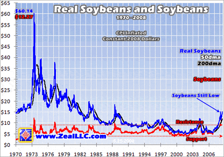 With the average soybean price since 1970 just over $6, the $14 we see today has gotten folks really excited about this commodity. But though today's price levels are nominal all-time highs well above long-term resistance, there is still a long way to go before this bean gets near its real high of $60.
