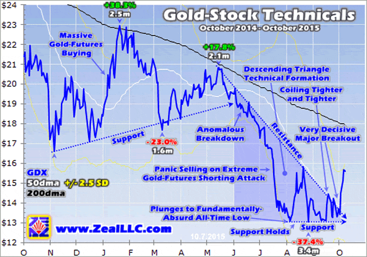 The left-for-dead gold stocks have rallied dramatically this past week, surging to a major breakout. This pivotal technical event reveals the hyper-bearish psychology plaguing this sector in recent months is dissipating, paving the way for investment capital to return. And given the fundamentally-absurd price levels in this battered sector, this new gold-stock buying is likely just the initial vanguard of a massive new upleg.