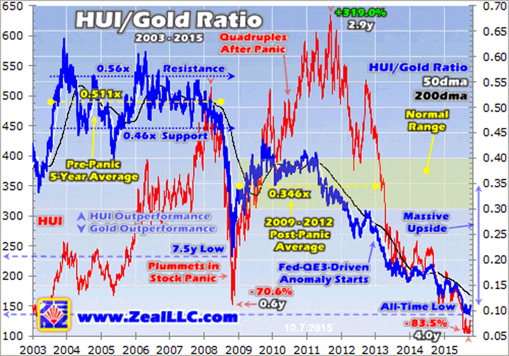 Though GDX’s history only extends to its birth in May 2006, the HUI index’s goes back a decade earlier to March 1996. So the all-time low in GDX terms in early August was accompanied by a 13.0-year low in HUI terms. The last time the gold stocks had traded at those extreme prices was way back in July 2002. The crazy part was gold was meandering around just $305 then, and had yet to exceed $329 in its young bull!