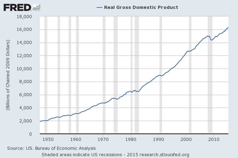 When you look at a chart of US GDP in US dollars, then it tells you that the US economy has been growing almost consistently – see below: Real GDP (inflation adjusted GDP) from US. Bureau of Economic Analysis: