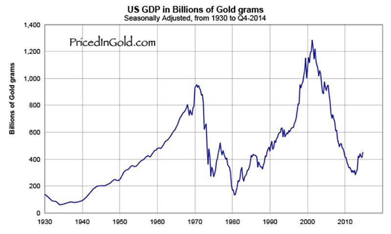 If you measure GDP in gold terms, see below – GDP as measured in Billions of gold grams (from PricedinGold.com):