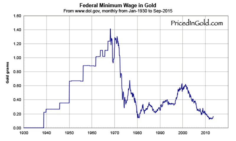 Again, these charts as measured in gold tell a completely different story. Wages are almost at the lowest it has been over the last 70 years.
