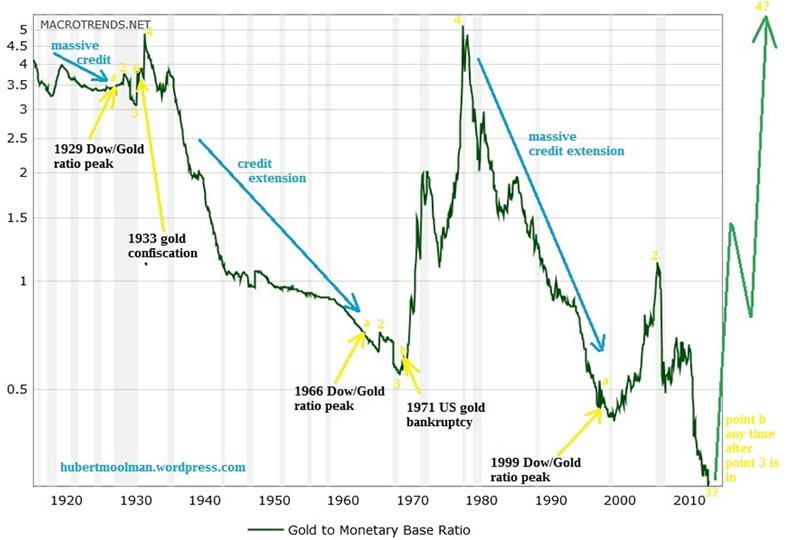 So, essentially this is a measure of the gold price relative to US currency in existence. This ratio is at an all-time low (extreme). Every time after it had reached an all-time low, based upon the patterns indicated (see point 3 in 1970 and 1932), we had a change in the monetary order.