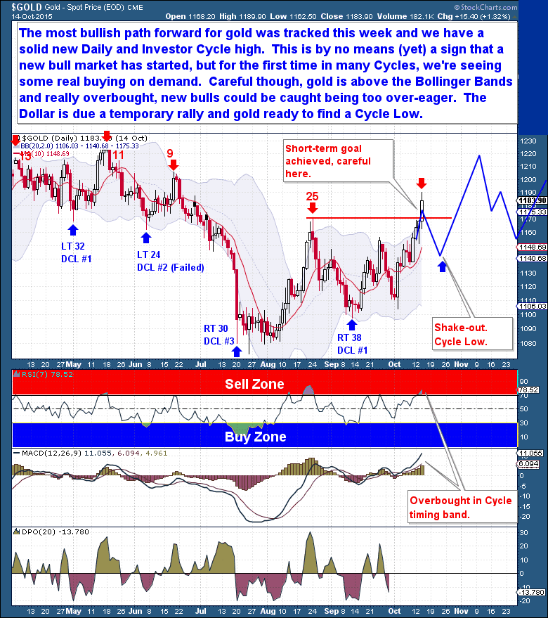 In the short term though, some caution is warranted. Gold is well above the Bollinger Bands and significantly overbought. From a Daily Cycle timing standpoint, we're deep into the Cycle and ready to begin a move towards the DCL. Even if the recent October 2nd Low marked a shortened Daily Cycle Low, gold in that case would still be ready to move lower into a Half Cycle Low. The point being, social media is suddenly a buzz over gold and a "new bull market". Everyone is suddenly jumping back in here after an already extended move higher. This is setup to teach the bulls a little trading lesson and to catch them being a little too over-eager. Beyond a possible shake-out, the gold Cycle look very encouraging and a transition away from a bear market could be developing.