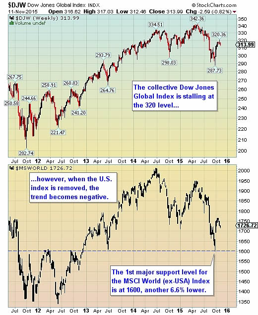 However, when the U.S. index was removed from the mix (lower graph in chart 1), the picture looks considerably weaker, indicating that only the U.S. index was supporting the global bull market.