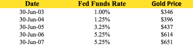 At the time, there was a similar narrative that rising interest rates would scupper the gains gold had seen in 2001 and 2002. Instead, the period of rising interest rates saw gold rise from $361/oz in June 2003 to $633/oz in June 2006 – a gain of 75%.