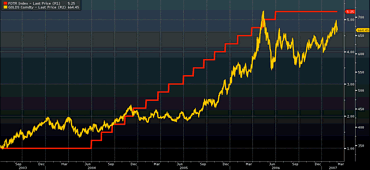 Fed Funds Rate and Gold Price (USD) – 2003 to 2007