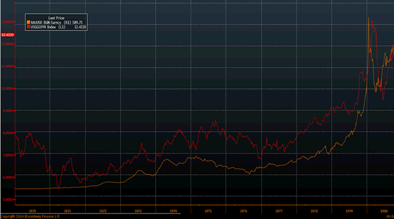 Gold and US 10 Year – 1970 to 1980 (GoldCore via Bloomberg)