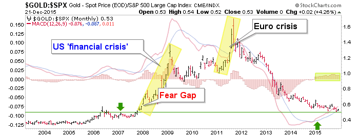 Since we are on a big picture theme, let’s stick with monthly charts and review another NFTRH chart that is actually just another view of the reset in sentiment that needed to happen on the macro. You remember those “Knee Jerks” running into gold from the Euro Crisis? Here is a picture of any left over US Financial Crisis refugees having completely closed out the fear and angst of 2008-2009. Gold vs. SPX has been sent back to the hell it came from and conventional market participants are back in automatic thinking mode as once upon a time.