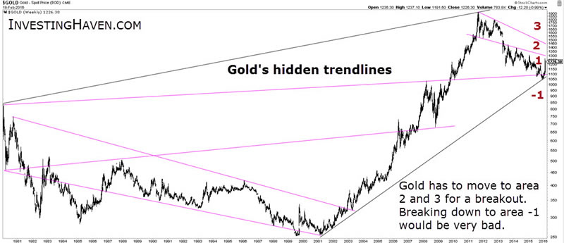 In order for a meaningful trend change to take place, gold has to move to area 2, and, ultimately, area 3 if it aims to continue its secular bull market. We are not there yet. Watch $1,300 and $1,450 as key price points: gold’s ability to sharply break those price levels, or inability to break that resistance, will tell us whether a real trend change will take place.