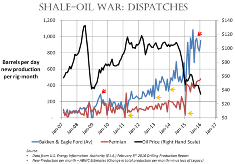 Productivity per rig in Bakken and Eagle Ford more than doubled from 2011 to 2014, and then when the price-slump started it almost doubled again, pretty much the same story in Permian. Seems that a similar increase in productivity happened in 2009, the last time oil prices tanked (red arrows).