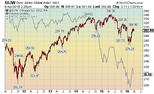 Since the rollover of oil prices starting in mid-2014, the Dow Jones Global Index has struggled to hold to a bullish trend (Chart 2).