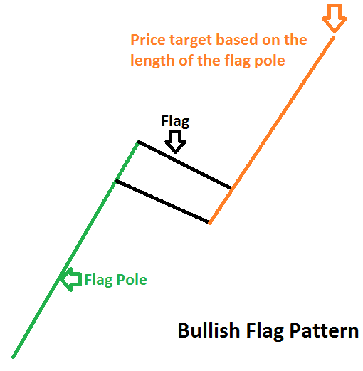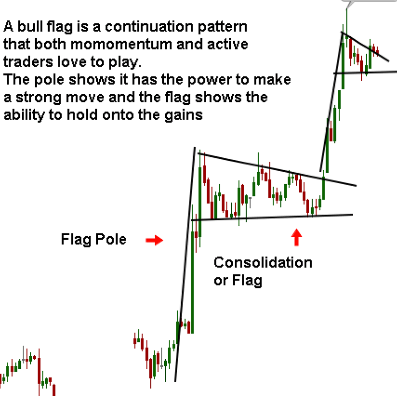 A Bull Flag is a technical pattern designating a strong uptrend. The pole is the impulse move and the flag is a period of consolidation of the move. The bullishness comes from the underlying psychology where despite the strong vertical rally of the pole, price refuses to drop back to the beginning of the pole. Once the consolidation of the flag is over price rises in a powerful move higher measuring the length of the prior flag pole. Below are two examples of this principle. The first is the idealized model and the second is an example from the real world.