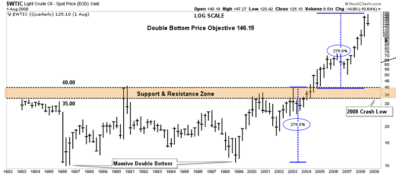 Since 1981 the BGMI has been consolidating the flag pole gains of the previous 20 years from 1960-80. After such large gains markets typically take a prolonged period to digest them. Once this process is complete the market will be ready to break out of its consolidation and advance to the next level. Referring back to the first chart, we are able to project a measured move using two techniques, an impulse to impulse move and a channel height measured move. Both of these methods achieve similar price objectives. The bull flag traces out a 4 point continuation pattern over a 36 year period. This pattern projects an upside measured move equal to the length of the impulse of the flag pole from 1960-80. Secondly, the 36 year channel height projects a move to virtually the same objective as the impulse method. Here we stack the width of the channel on top of the upper boundary to achieve our price objective. An excellent example of this occurred with the long term price breakout in the oil market in 2004. After a 30 year $10-40 consolidation range oil broke out and traveled the width of its channel to a perfect measured move objective. The pole leading into this channel beginning in 1974 went from $1.85 to $40 bbl. This was such a huge percent move that it took 30 years to consolidate, similar to the BGMI. Once this consolidation was complete it broke out and began a 3 year impulse move to $147. Amazingly, this was the same percent move as its channel height which had contained it for 30 years. This move is shown in the chart below and this same technique measures the BGMI’s ultimate price objective to 9570.
