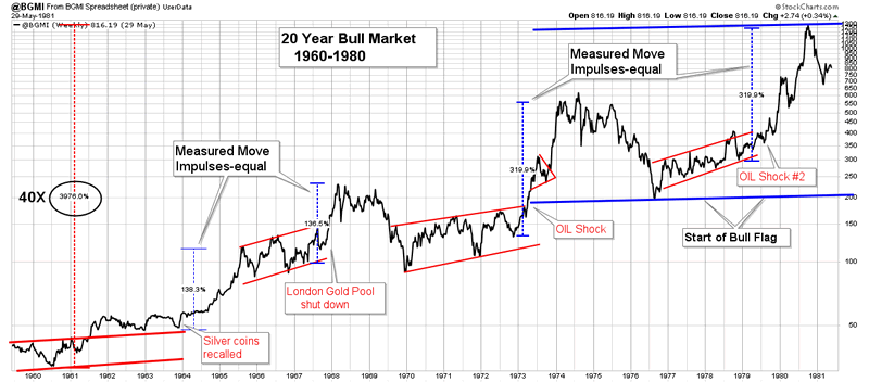 Let’s drill down and look at the 20 year bull market that makes up the flag pole in the first chart. The period from 1960-80 encompassed several events all related to the unleashing of gold. In 1954 the Swiss removed the price ceiling on gold traded in Switzerland, meanwhile the free market also opened in London in that year. Monetary expansion occurred surreptitiously throughout the 1940’s-1950’s despite the US fixing its gold price. Eventually this created an upward force on gold. As a result, in 1961 eight of the most powerful central banks created the London Gold Pool, with the intent to cap the price at $35. This was an open and admitted operation to prevent the price of gold from rising by selling real bullion into the market.