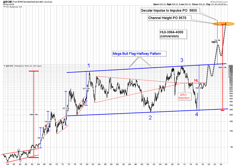 The above chart encapsulates a giant 50 year secular bull market in the gold stocks with a mega-sized bull flag dominating the majority of the range. It’s initial impulse began back in 1960 and had a 20 year 40X run. It then underwent 36 years of consolidation while building out a massive bullish flag formation. It is my working hypothesis that this bull flag is actually a half-way pattern to the much larger complete secular move. If this is so we can expect an impulse move starting at point 4 of equal size as the move from 1960-1980. The implications of this sized move point towards gold playing a role as an anchor in the next monetary system. So far the gold price has not reflected the 50 times increase in credit and base money since the end of Bretten Woods I in 1971. Any new monetary regime that allows the gold price to parallel the growth in credit over the past 40 years would propel the gold stocks well above this bull flag. This monetary development would be the force behind the BGMI completing a measured move of 40X from its early 2016 lows. Gold would be revalued by an order of several magnitudes possibly to $5,000 to $10,000. Later on we will chronicle the macro environment which could lead to this outcome.