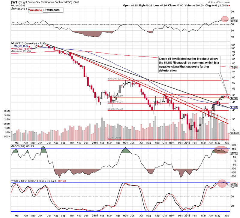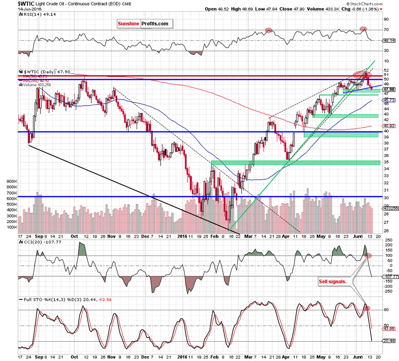 (...) crude oil extended losses, closing the day under the barrier of $50 and invalidating earlier breakout above it, which is a negative signal, which suggests a drop to the blue support line based on the late May and Jun lows. If it is broken, oil bears will test the green support zone created by the late-May and Jun lows (around $47.40-$47.75) in the coming day(s).