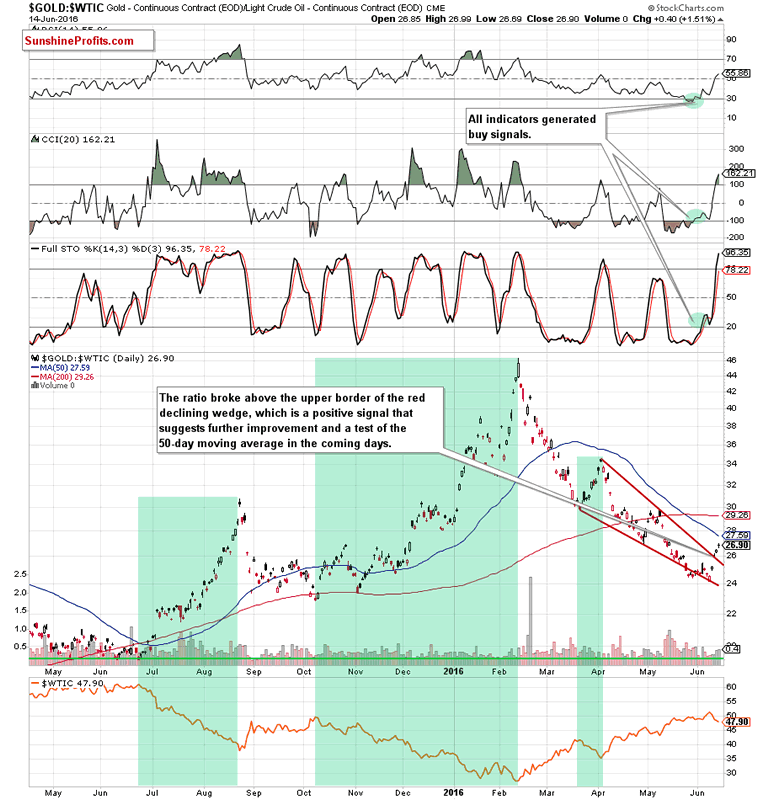 (...) the ratio invalidated earlier small breakdown under the lower border of the red declining wedge (seen on the daily chart), which resulted in further improvement and a breakout above the upper border of the formation, which is a very positive signal - especially when we factor in buy signals generated by all daily indicators.