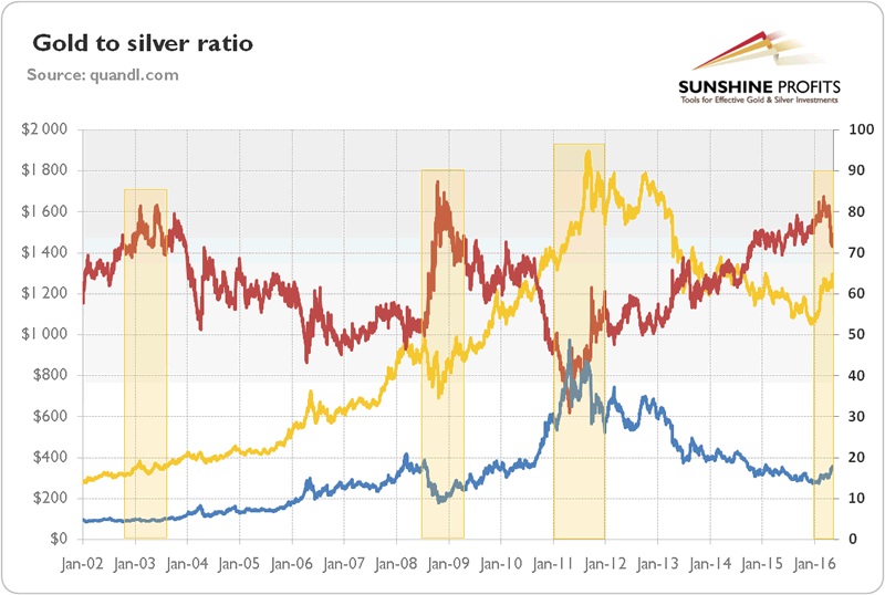 It is important to realize that the decline in the gold-to-silver ratio may correspond with the bull market in both silver and gold – the key to understanding this is the fact the precious metals tend to move in tandem, but gold precedes silver, as mentioned previously. Since the latter accelerates later and acts like “gold on steroids” (silver is more volatile than gold both during upside and downside moves), investing in silver increases potential profits, but also potential losses compared to gold. In other words, the gold-to-silver ratio may signal a trend in both metals. If the ratio is high (let’s say above 80), investors should increase their position in silver relative to gold, but they do not have to actually sell gold. The price of gold in silver ounces is likely to decline, but it does not mean that the U.S. dollar price of gold is also going to drop. Actually, the absolute price of gold should also increase, although at a slower pace than silver prices.